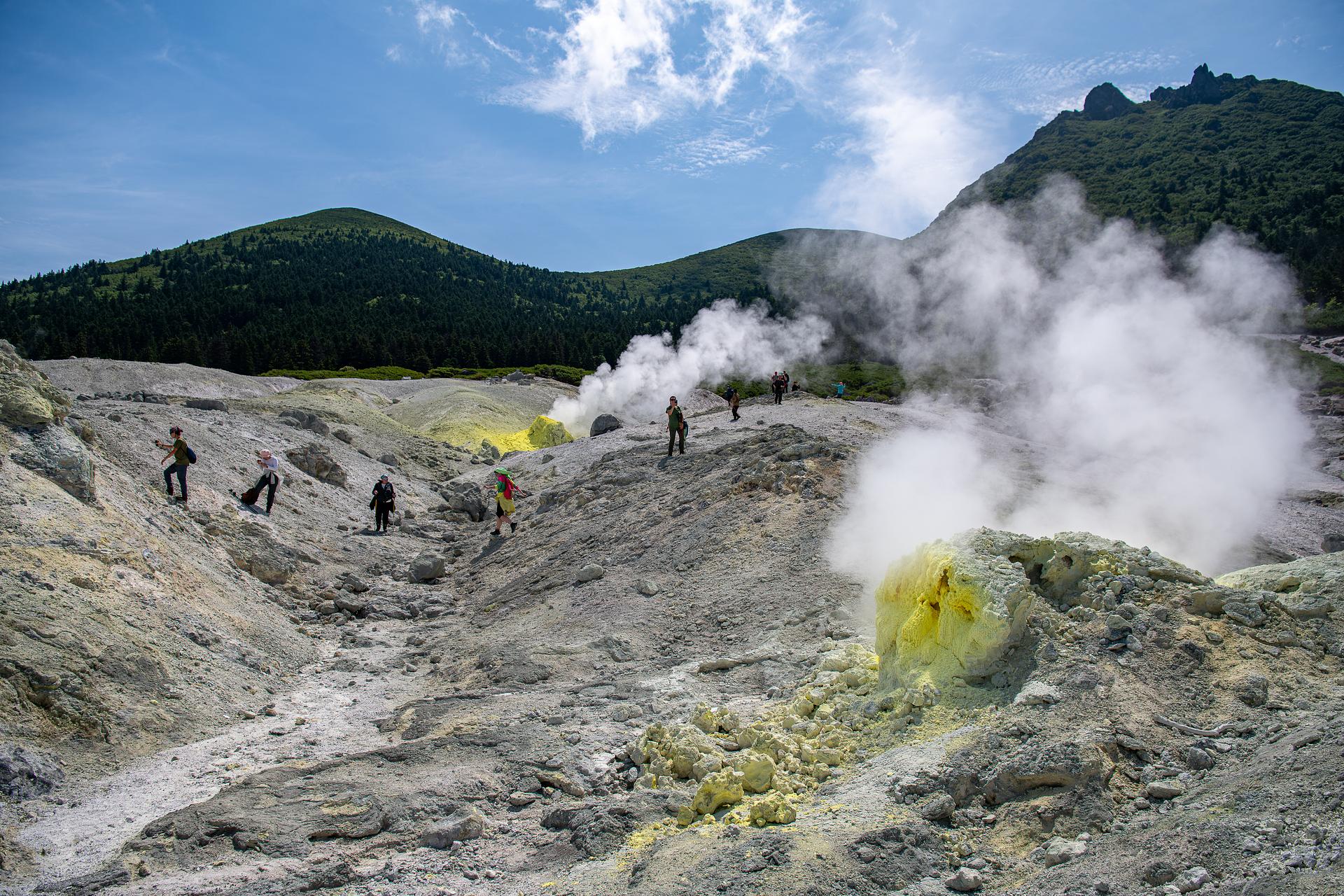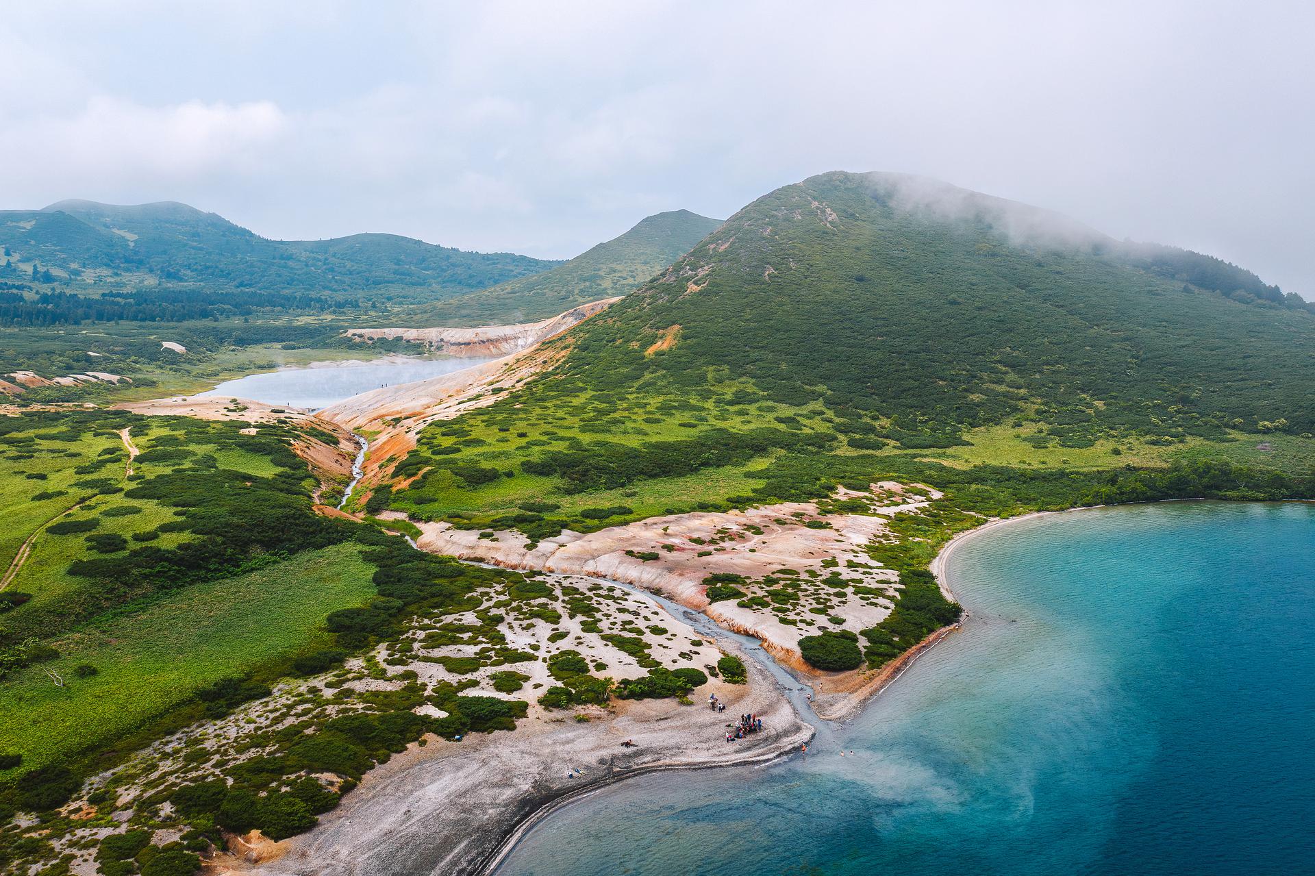 После завтрака отправимся к самому южному вулкану Курильских островов – вулкану Головнина. Отсюда до Японии всего пара десятков километров. Наша прогулка пройдет по кальдере активного вулкана. Маршрут довольно трудный, но идет по удобной туристической тропе. На месте кратера вулкана после древнего катастрофического извержения образовалось два озера – Кипящее и Горячее, названия которых говорят сами за себя. Вода в озере Кипящее подогревается вулканическими раскаленными газами, и в местах их выхода температура воды достигает +95°C. На берегах этого озера еще можно увидеть остатки японского промысла серы – металлические котлы и деревянные сваи. Поднимемся на обзорную площадку, откуда виден весь кратер вулкана Головнина, а на горизонте откроется вид на самый северный японский остров Хоккайдо. Пообедаем с видом на озеро. Вечером вернемся в Южно-Курильск.
