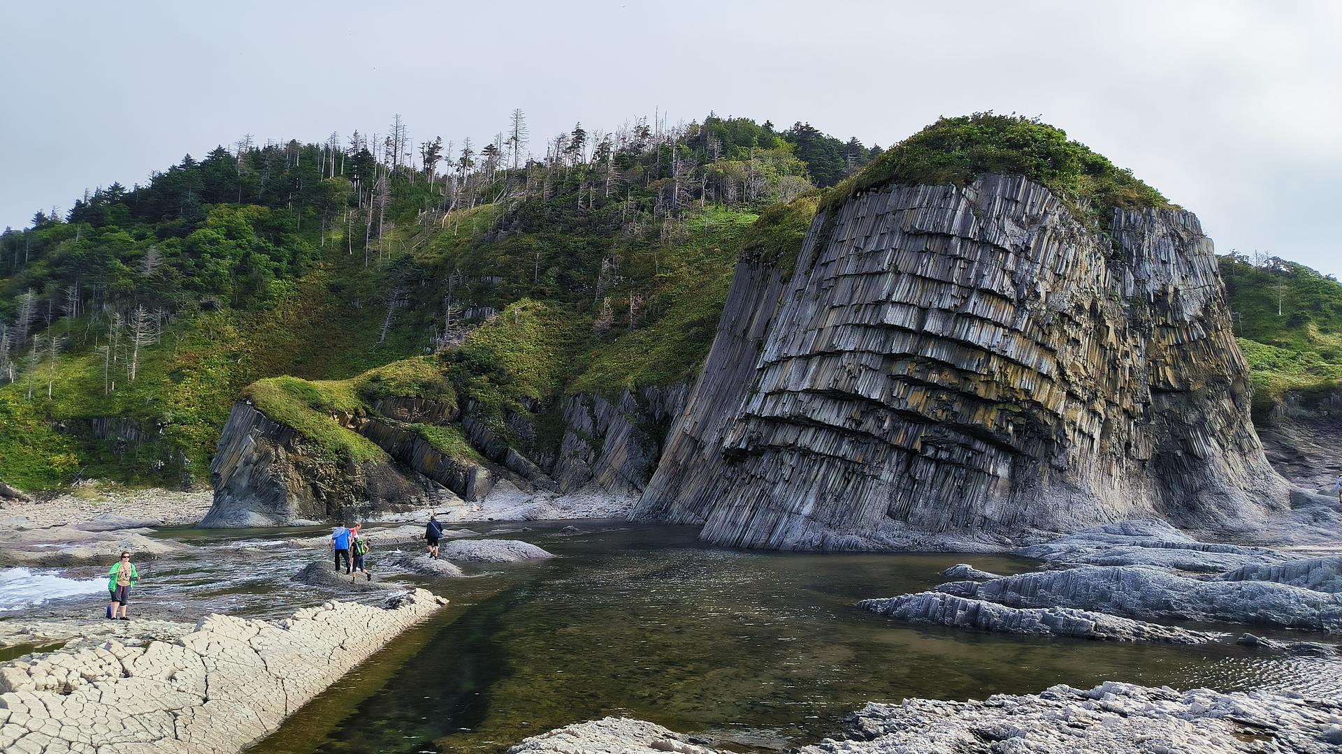 Сегодня отправимся к мысу Столбчатому. Путь до мыса идет по экологической тропе Столбовской Курильского заповедника. Мы познакомимся с редкими реликтовыми растениями острова, увидим медвежью тропу и искупаемся в горячих источниках. У берега Охотского моря остановимся у Голубых скал (их еще называют Монахами) и пройдем вдоль берега моря до нашей конечной точки. Мыс Столбчатый сложен застывшими базальтовыми образованиями в виде пяти- и шестигранных колонн, возникающих при остывании лавы. Это явление называется «столбчатая отдельность», отсюда и название мыса. После обеда на берегу моря вернемся в Южно-Курильск.