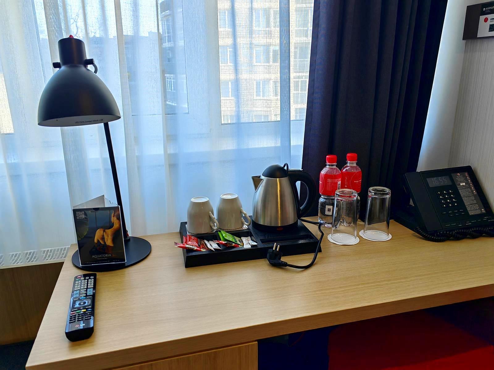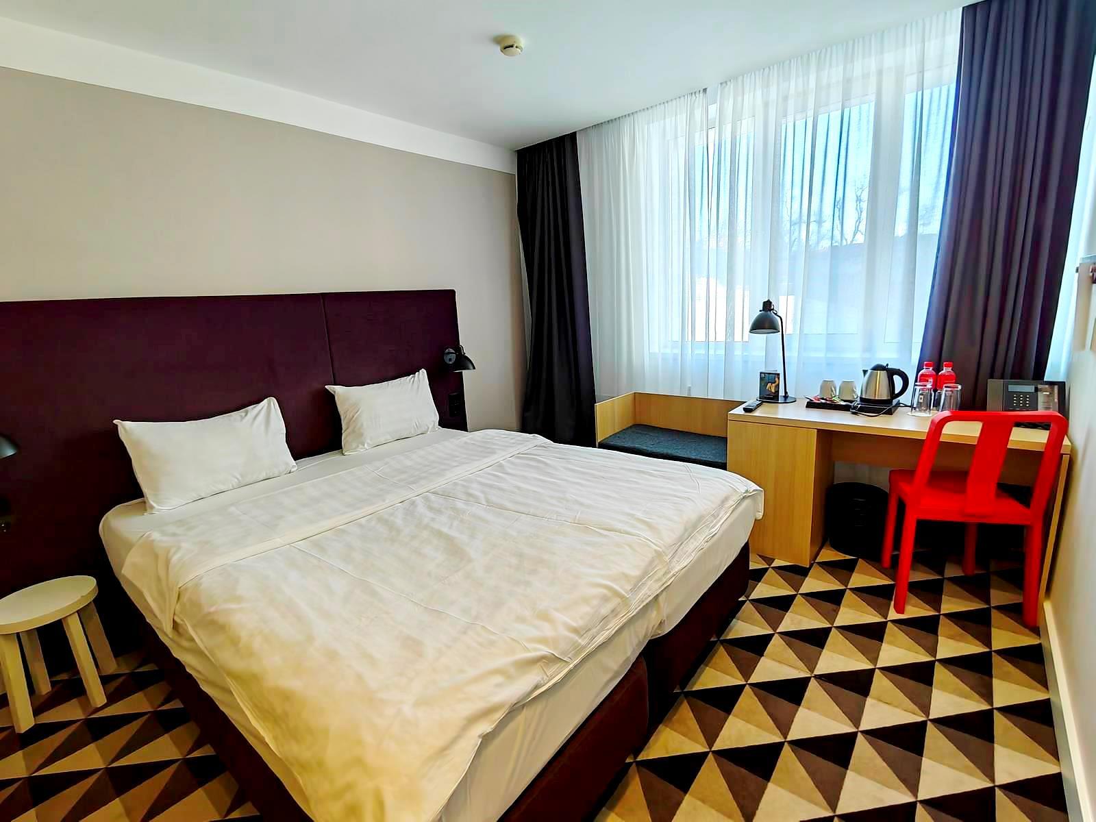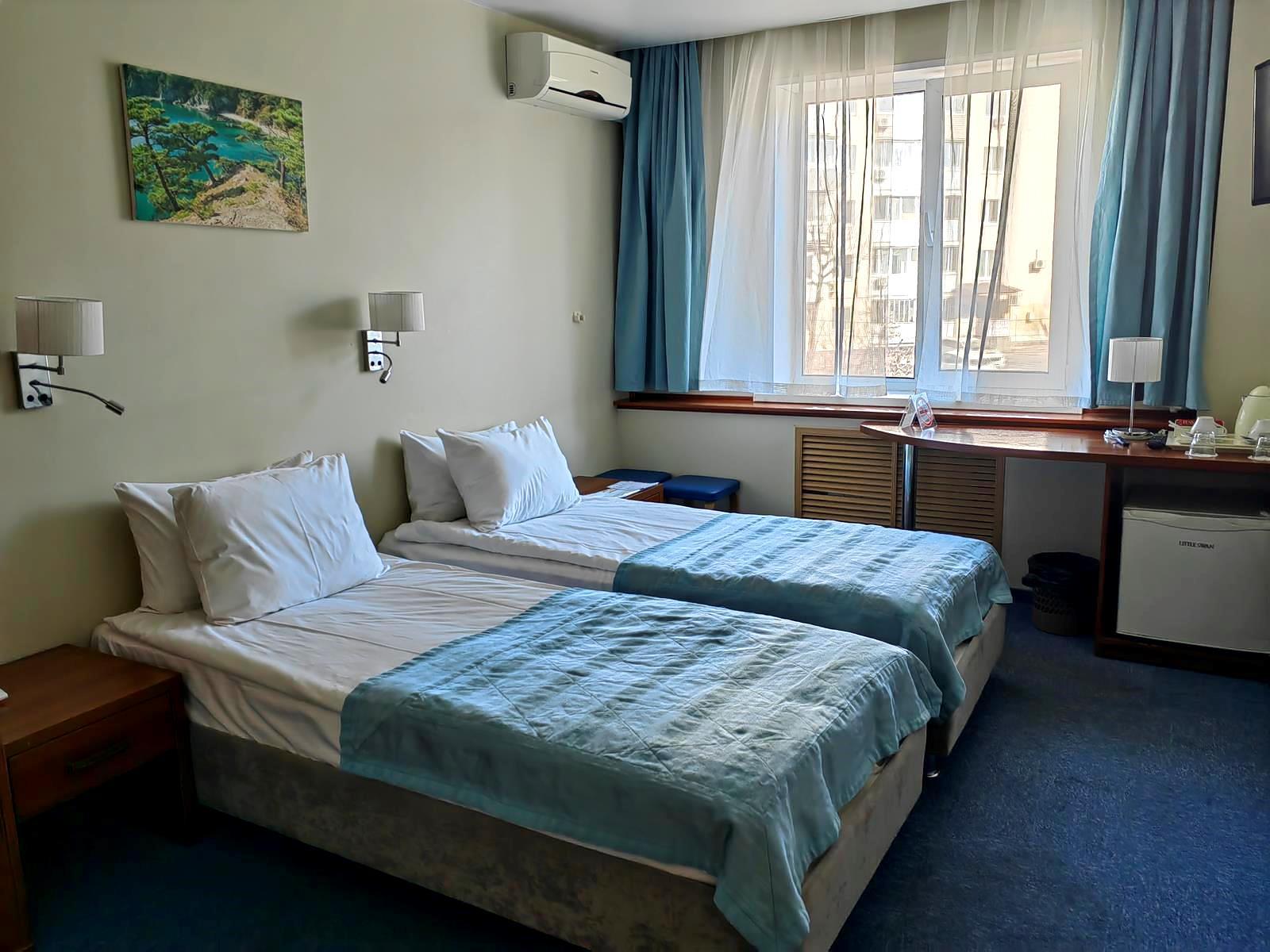 - стандарт (2-местный). Площадь 18 м2. В номере: двуспальная кровать или две односпальные, шкаф, письменный стол, холодильник, ЖК-телевизор, чайная станция. На всей территории отеля действует бесплатный Wi-Fi. Для Вашего комфорта бесплатно предоставляются тапочки, мыло, гель для душа, шампунь, шапочка для душа, зубной и швейный набор.