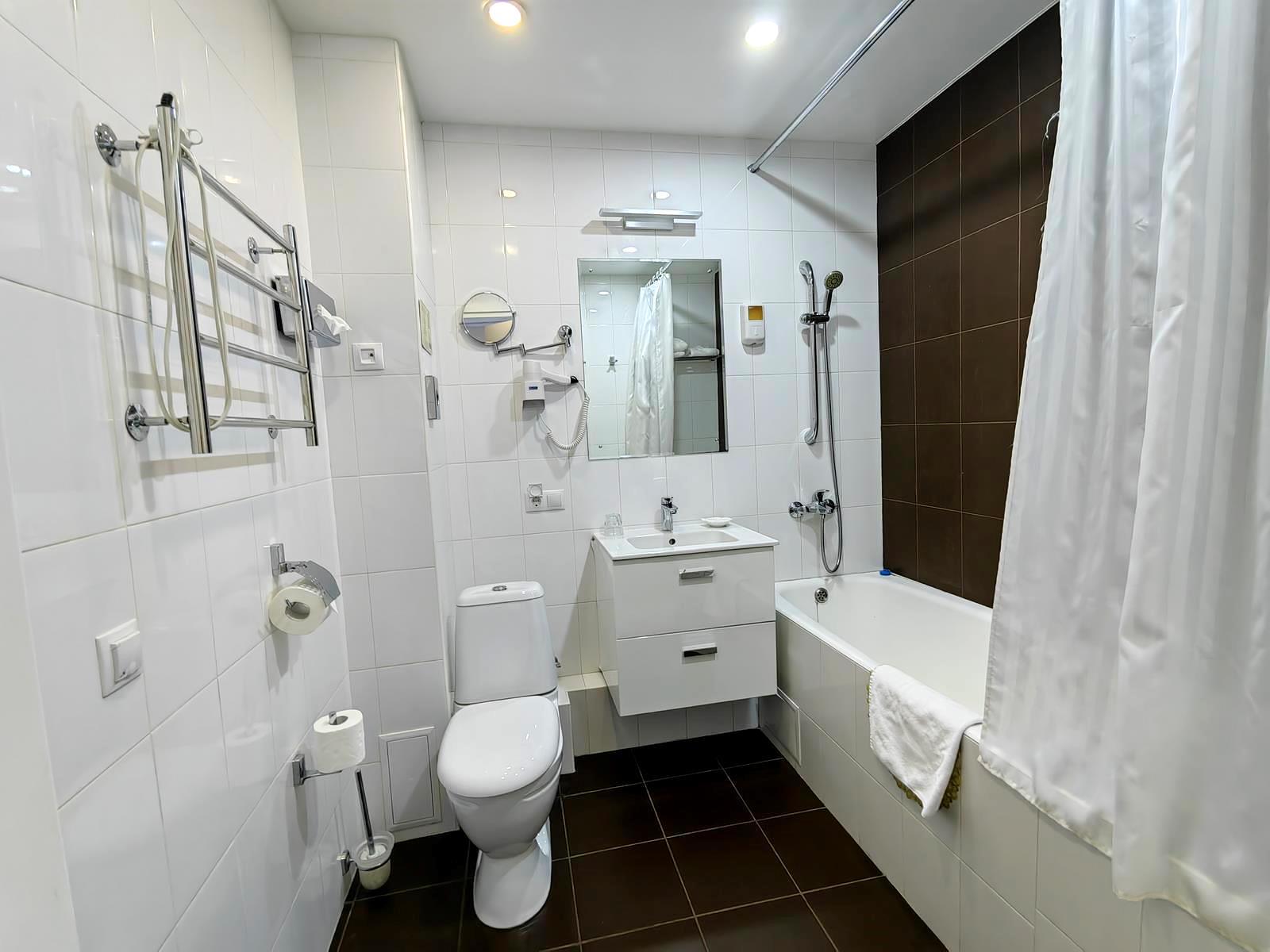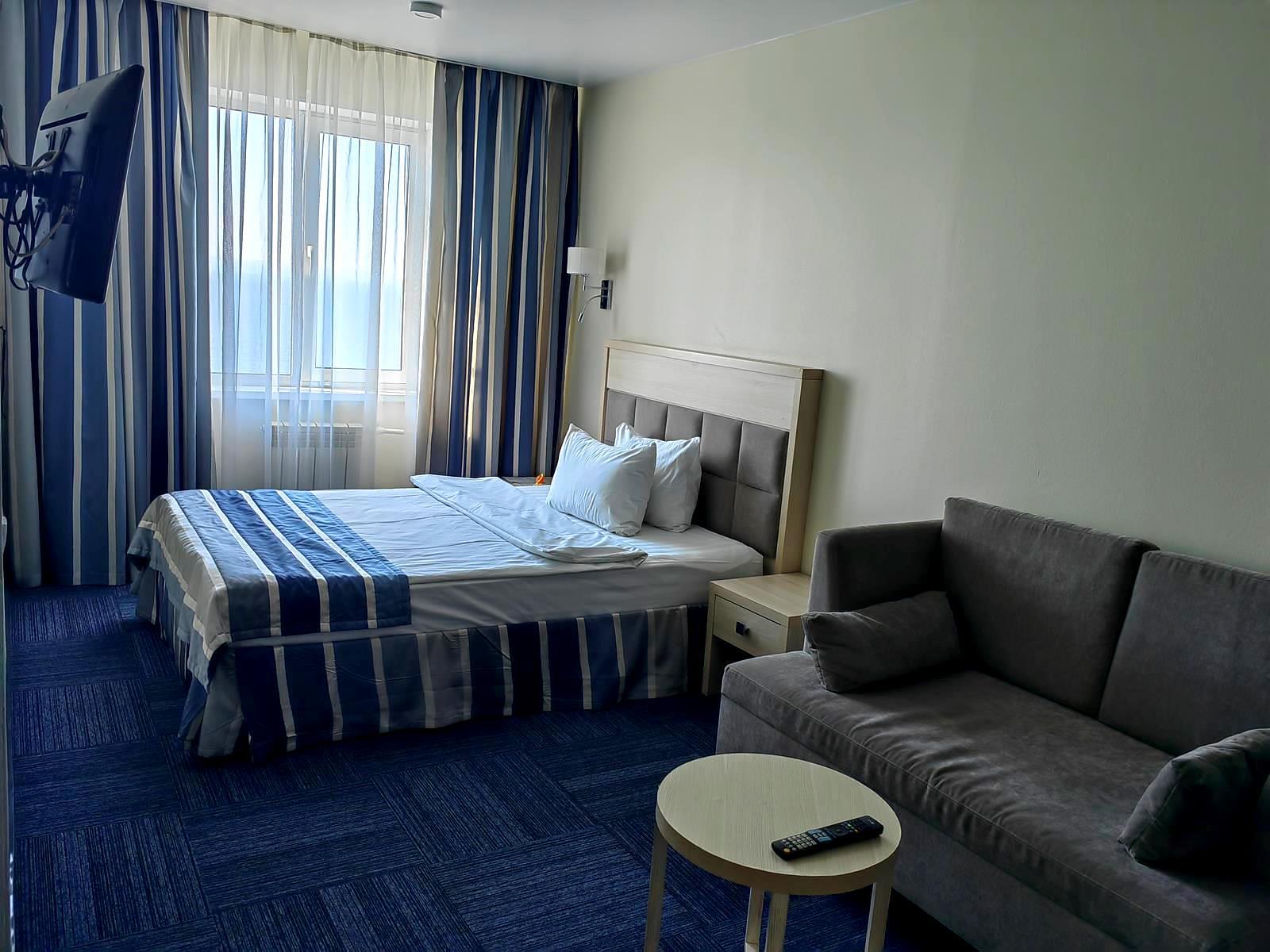 - Полулюкс. Двухкомнатный уютный номер 25 кв.м. Номер состоит из гостиной и спальни. В номере: телефон, телевизор, Wi-Fi, ванна, туалет, холодильник, письменный стол, стул, диван в зале, посуда, термочайник, кондиционер, двуспальная кровать в спальне, халаты, туалетные принадлежности.
