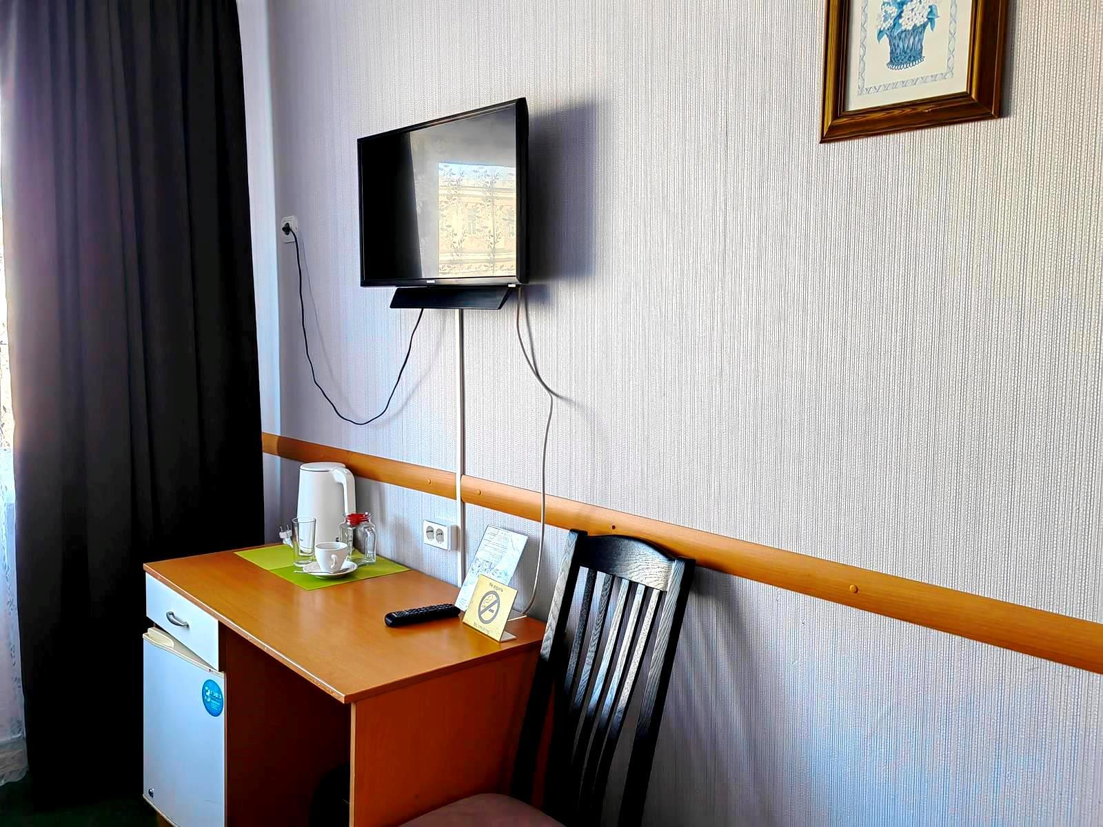 - 1-местный стандарт. Номер 12 кв.м. с видом на город. В номере полутораспальная кровать, телефон, телевизор (кабельное телевидение), Wi-Fi, холодильник, стол, стул, шкаф, тумба, душ и туалет.