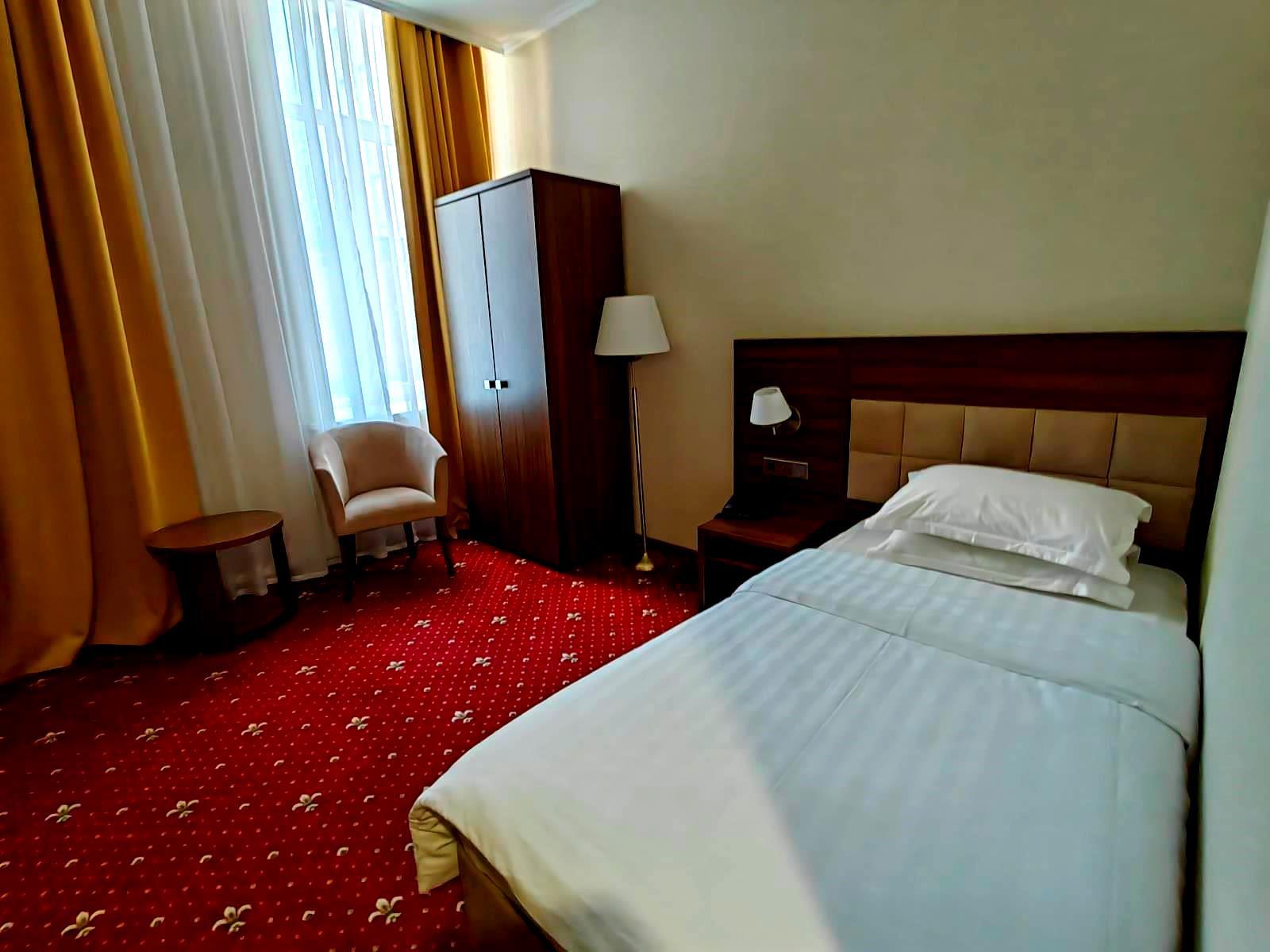 - стандарт (1-местный). Площадь 18 м2. В номере: односпальная кровать, шкаф, письменный стол, холодильник, ЖК-телевизор, чайная станция. На всей территории отеля действует бесплатный Wi-Fi. Для Вашего комфорта бесплатно предоставляются тапочки, мыло, гель для душа, шампунь, шапочка для душа, зубной и швейный набор.