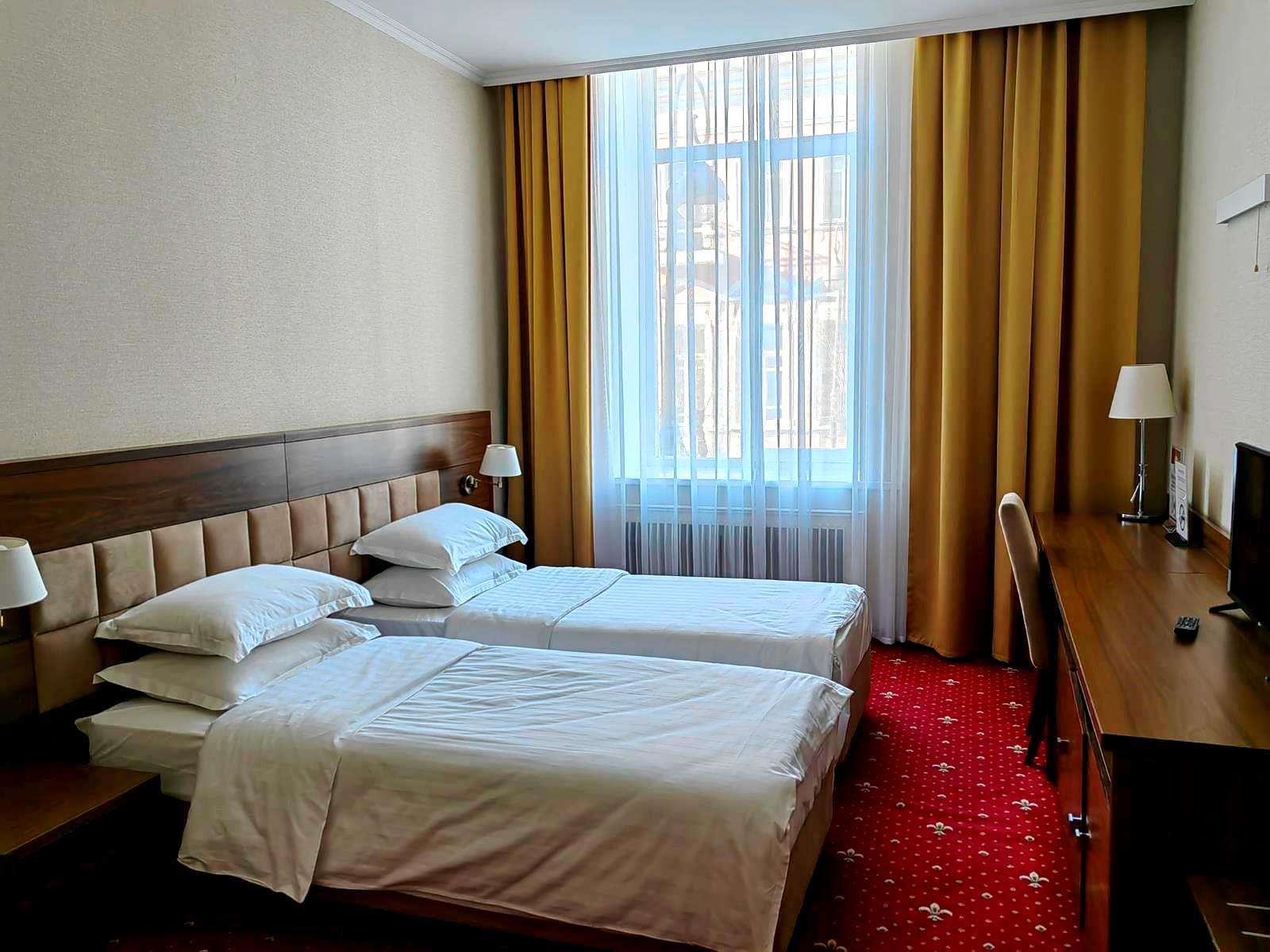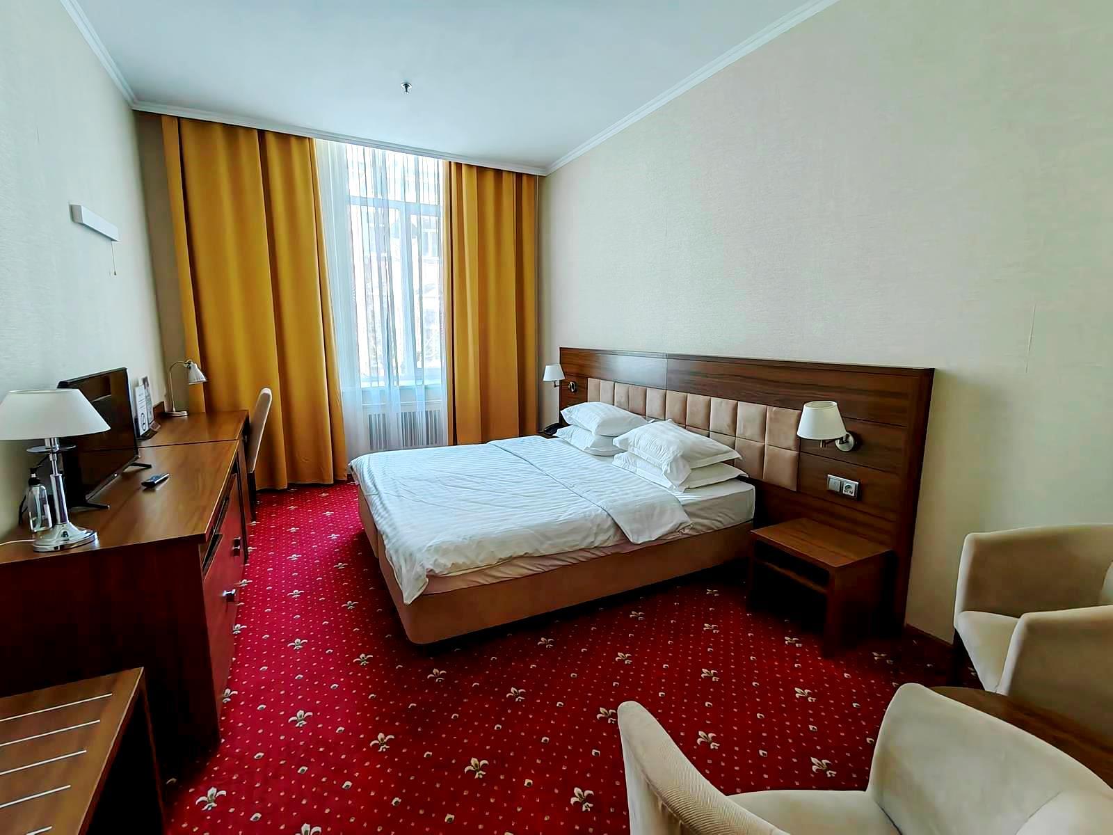 - стандарт (2-местный). Площадь 18 м2. В номере: двуспальная кровать или две односпальные, шкаф, письменный стол, холодильник, ЖК-телевизор, чайная станция. На всей территории отеля действует бесплатный Wi-Fi. Для Вашего комфорта бесплатно предоставляются тапочки, мыло, гель для душа, шампунь, шапочка для душа, зубной и швейный набор.