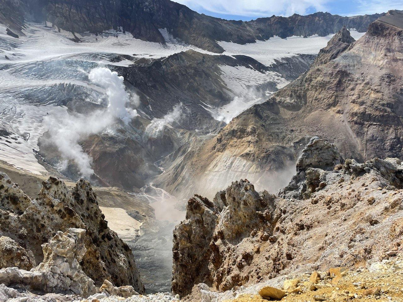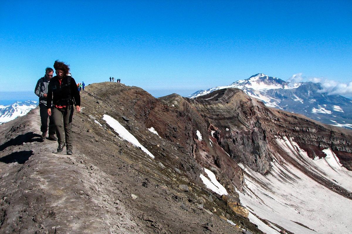 При восхождении на вулкан гиды обеспечивают безопасность маршрута, комфортный темп восхождения.