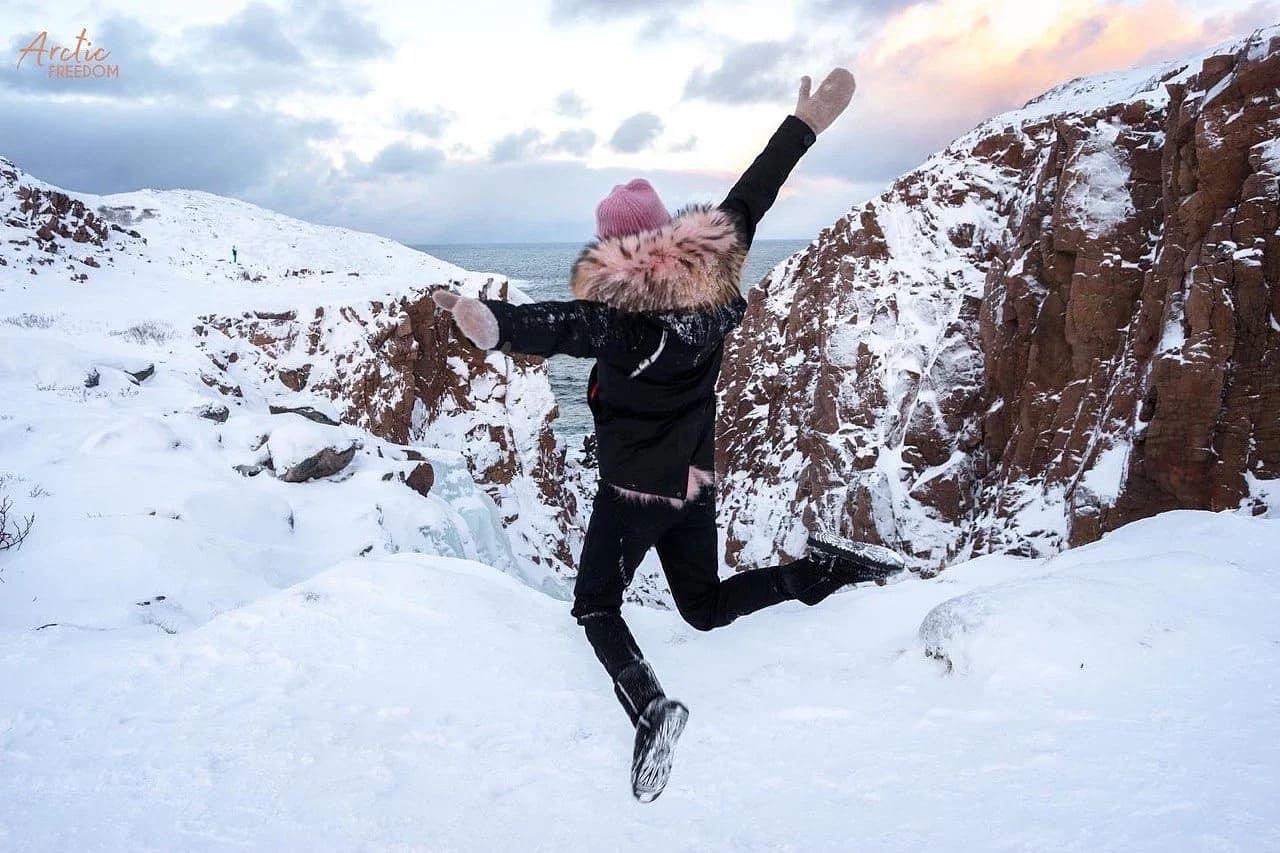 Мы отправимся к знаменитому галечному пляжу. Вы увидите округлые валуны вблизи, сможете потрогать их, взобраться на них и сфотографироваться.А еще увидим тот самый водопад, который вы видели на множестве фотографий — ощутите свободу, стоя прямо на краю перед Северным Ледовитым океаном.