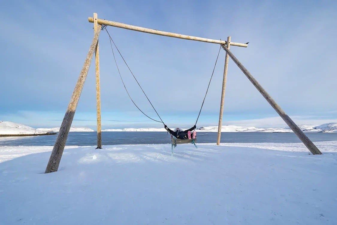 Мы сделаем остановку на песчаном пляже у ресторанов Териберки, где можно покачаться на огромных качелях прямо у моря.